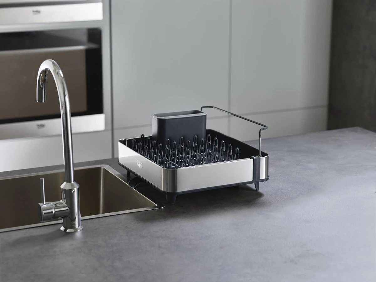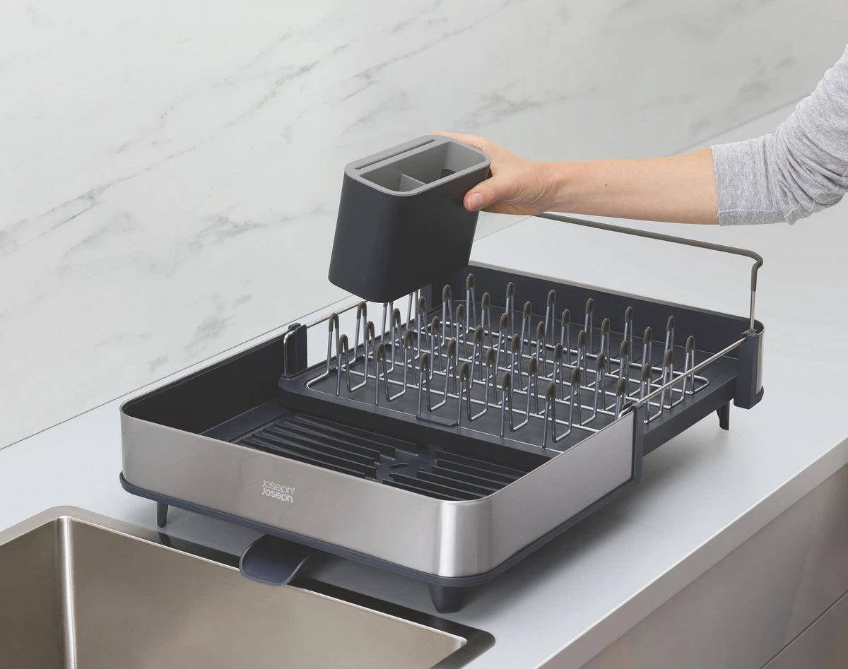 Dit handige Extend Steel afdruiprek van Joseph Joseph is ideaal voor zowel kleinere als grotere huishoudens, omdat hij uitschuifbaar is. Afhankelijk van de ruimte die je tot je beschikking hebt, kun je hem zo ver uitschuiven als nodig is. Het stalen rek is ideaal voor je glazen, mokken en borden en bevatten een speciale beschermende laag tegen het krassen. De basis van het afdruiprek is voorzien van ribbels zodat het water niet vast blijft zitten onder de vaat. Ook zorgt het ervoor dat het water naar een gootje wordt geleid waardoor het water zo weer de wasbak in druppelt. Dit gootje is, afhankelijk van de ruimte, heel gemakkelijk in 3 verschillende posities te draaien. Het afdruiprek bevat verder ook nog een bestekbak met speciale sleuven om scherpe messen in te zetten.