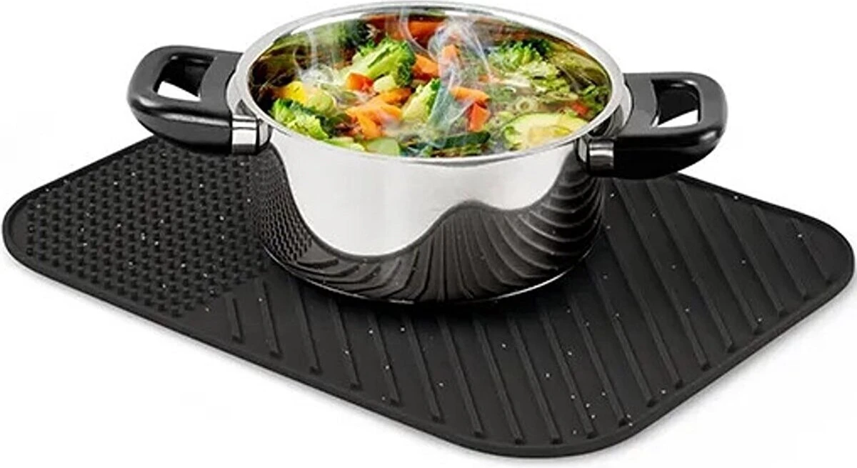 - Thermische isolatie: onze afwateringsmat heeft de functie van thermische isolatie en bescherming tegen verbranding. Het zachte rubberen oppervlak beschermt servies en glas tegen splinters en krassen. Het is hittebestendig (tot 220 °C), zodat je het als onderzetter kunt gebruiken om werkbladen en tafels te beschermen tegen hete pannen of huishoudelijke apparaten, of als koelrooster te koelen.