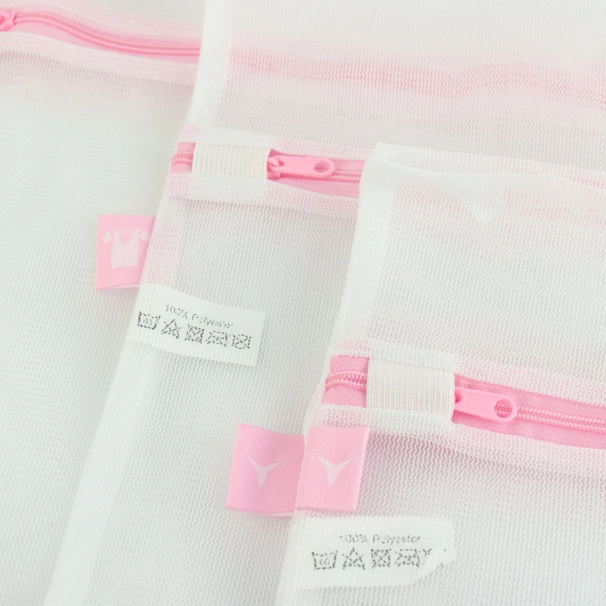 Set van 4x stuks waszakjes/wasnetjes wit/roze in 3 formaten. Deze waszakjes beschermem klein wasgoed, zoals bh’s of panty’s tijdens het wassen en centrifugeren. Voorzien van een rits sluiting. Afmetingen: ca. 46 x 50 cm, 34 x 43 cm en 26 x 33 cm. Materiaal: polyester.