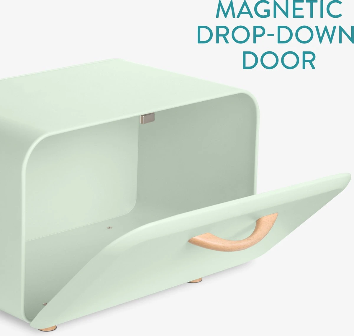 - Deze broodtrommel heeft een deurtje aan de voorkant om hem te openen. Zo neemt hij minder plaats in beslag op het aanrecht, omdat je er gewoon dingen bovenop kunt zetten. Bovendien kun je hem ook in of onder een kastje te zetten.