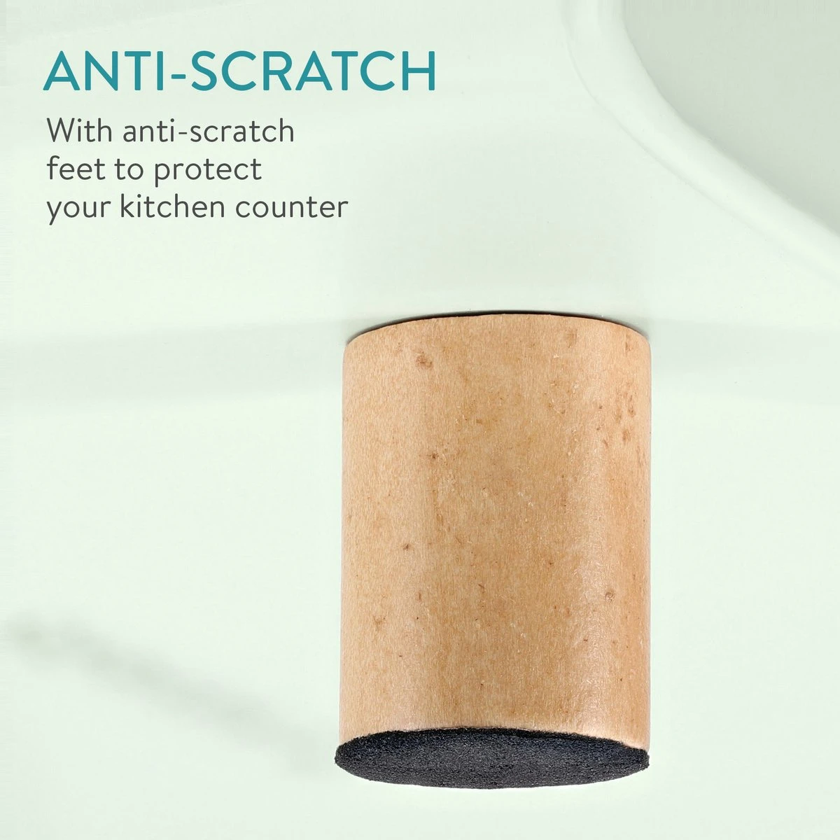 - UNIEK DESIGN: Het handvat en de pootjes zijn gemaakt van echt beukenhout. Dit vormt een bijzonder contrast met het metalen oppervlak en creëert zo een unieke look. De viltjes aan de pootjes voorkomen krassen op het aanrecht.
