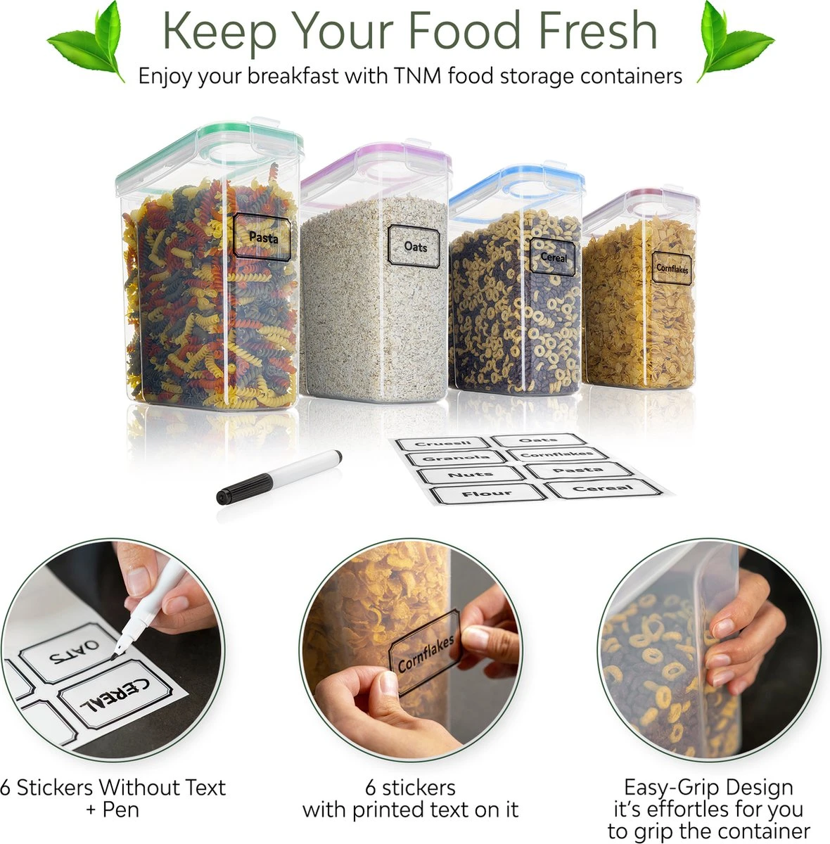 BPA-VRIJ Materiaal – De TNM-voorraadpotten zijn gemaakt van doorzichtig BPA-vrij plastic en u hoeft zich geen zorgen te maken dat giftstoffen in uw etenswaren sijpelen. Het doorzichtige plastic maakt het ook gemakkelijk om bij te houden hoeveel voeding je nog over hebt.