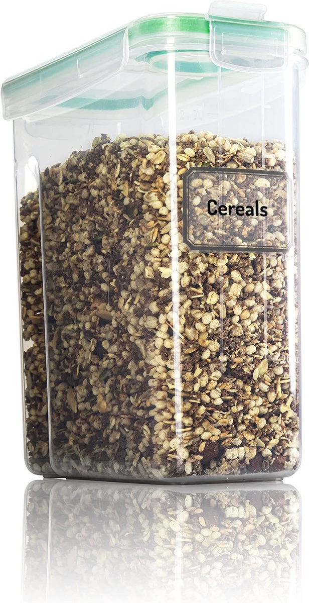GEEN muffe granen meer : Veel mensen kiezen voor ontbijtgranen bij het ontbijt. Zodra de ontbijtgranenverpakking word geopend verdwijnt de knapperige heerlijkheid van de ontbijtgranen. Door de 4 zijdelings vergrendelbare deksels met siliconen afdichting zorgt dit product ervoor dat er geen lucht of water binnenkomt, waardoor uw ontbijtgranen supervers blijven.